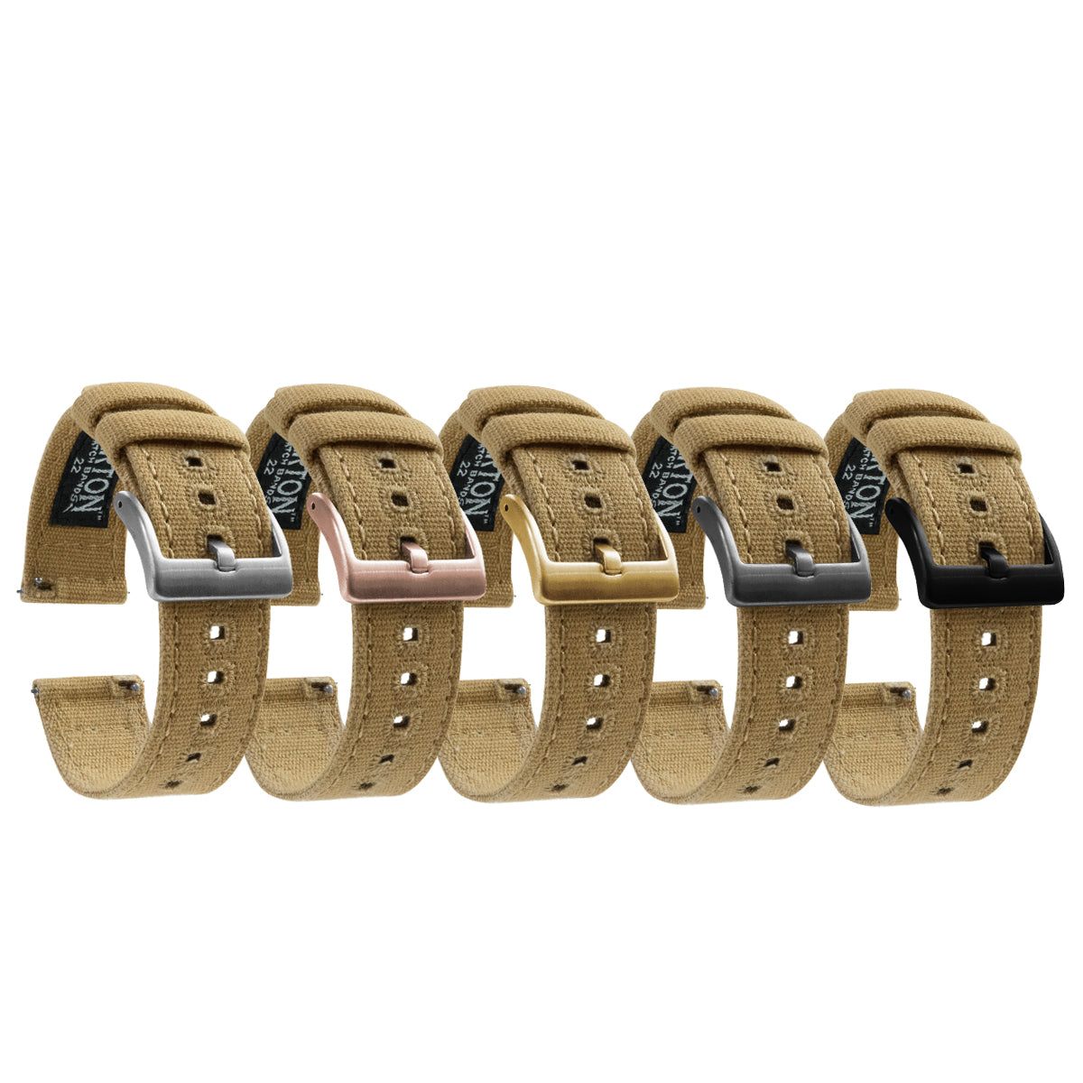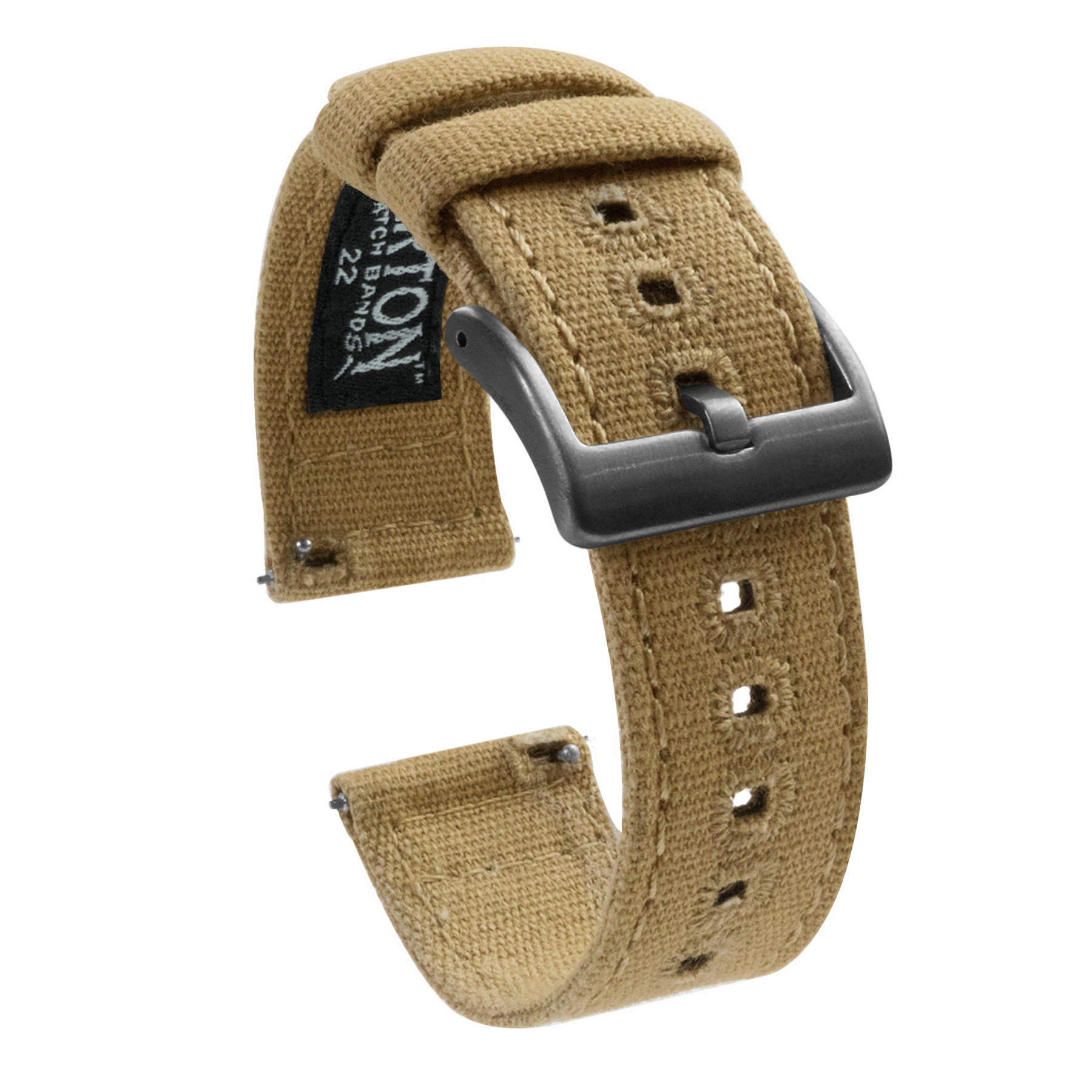 Our Canvas Quick Release watch bands are meticulously crafted from highly durable canvas and embroidered for style and strength. This khaki tan watch strap adds character to any timepiece and can be swapped in and out without any tools! Pair this khaki canvas watch band with our Silicone or Leather Quick Release to take full advantage of the opportunity to 'Switch it Up'.