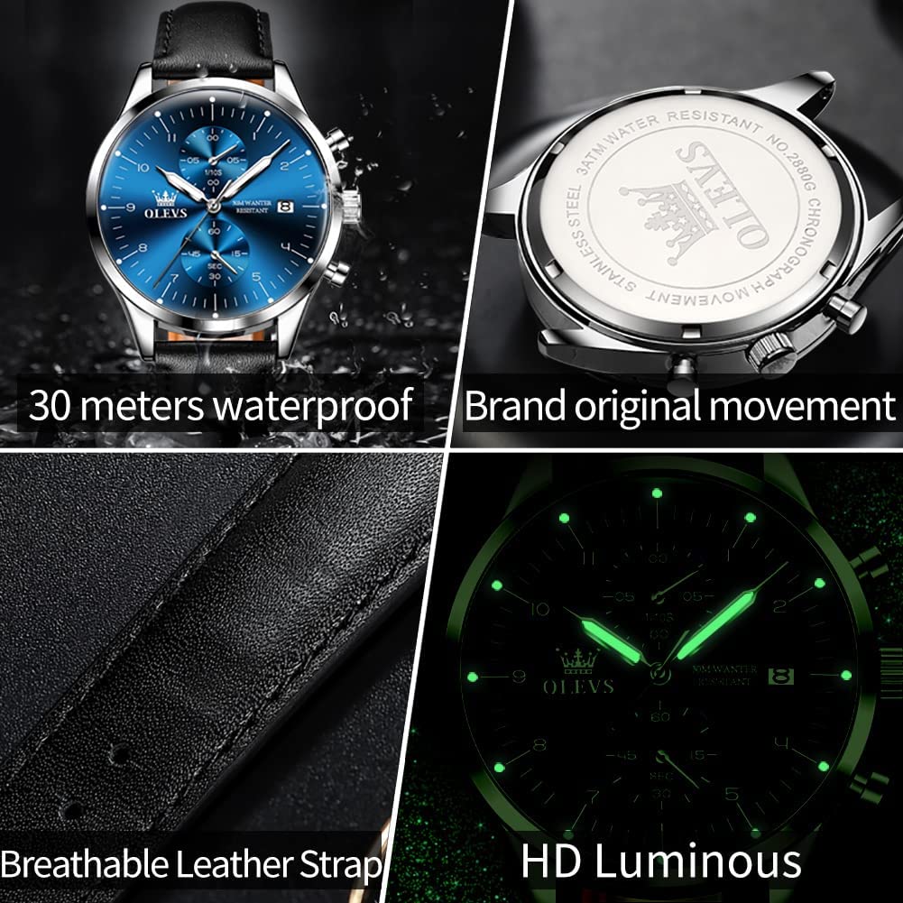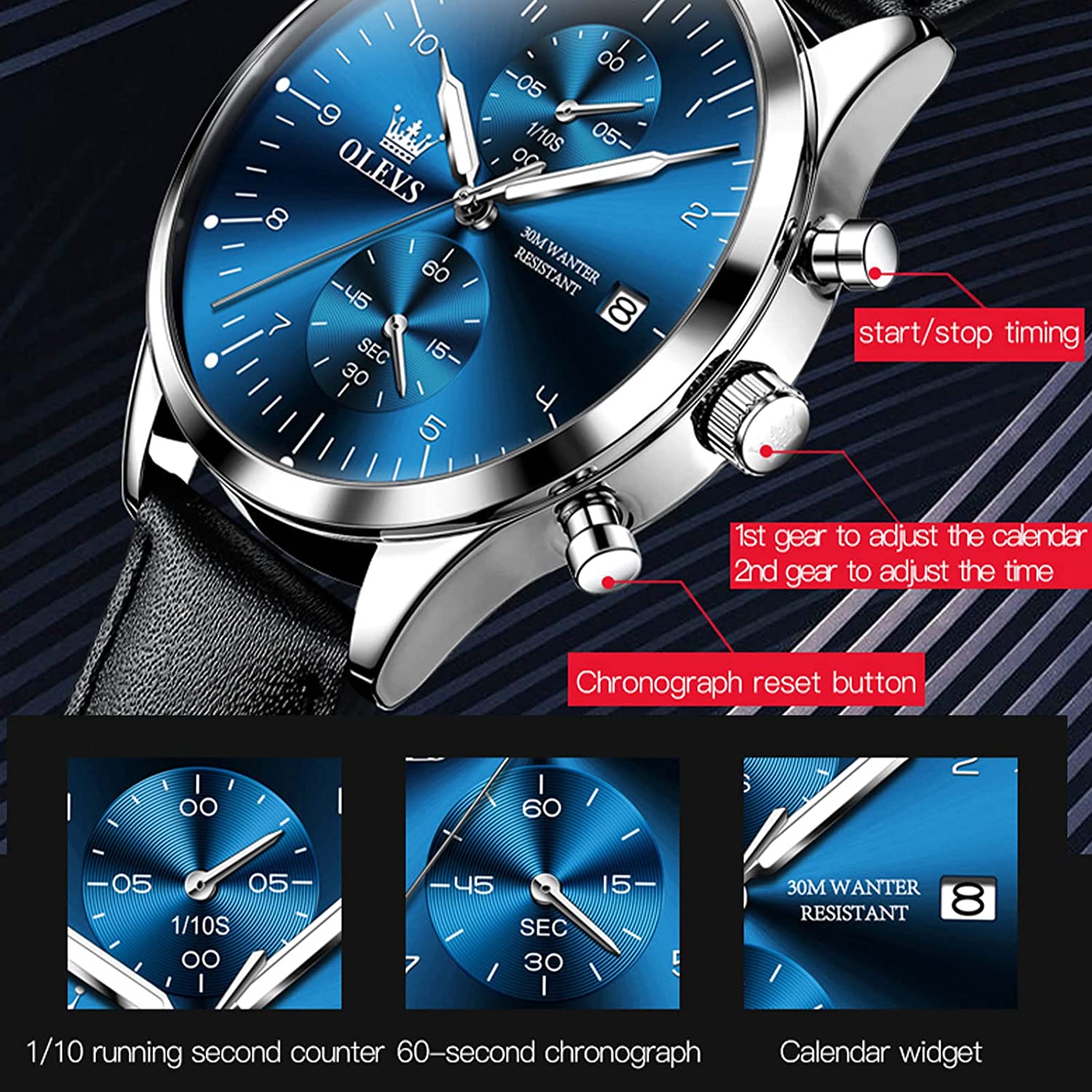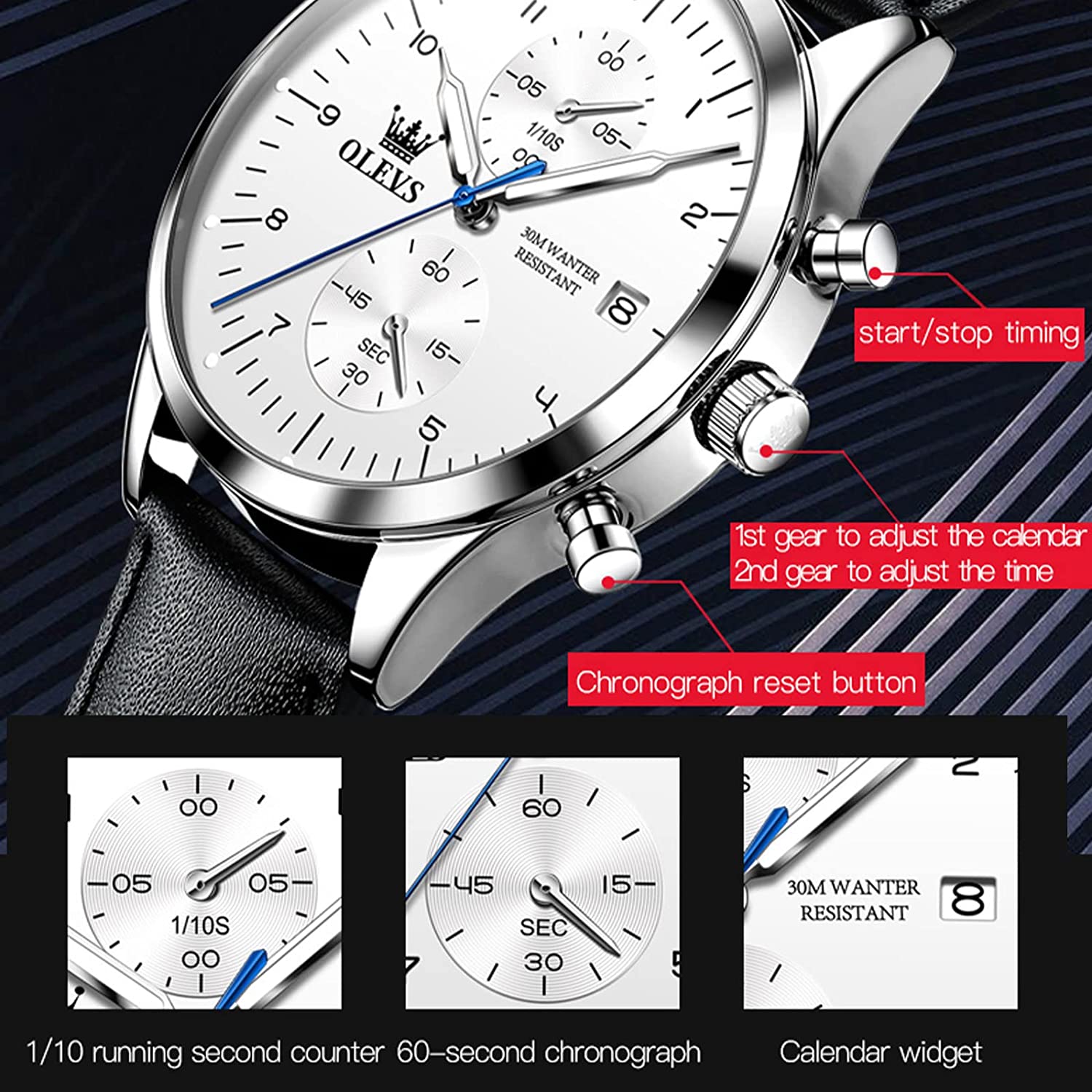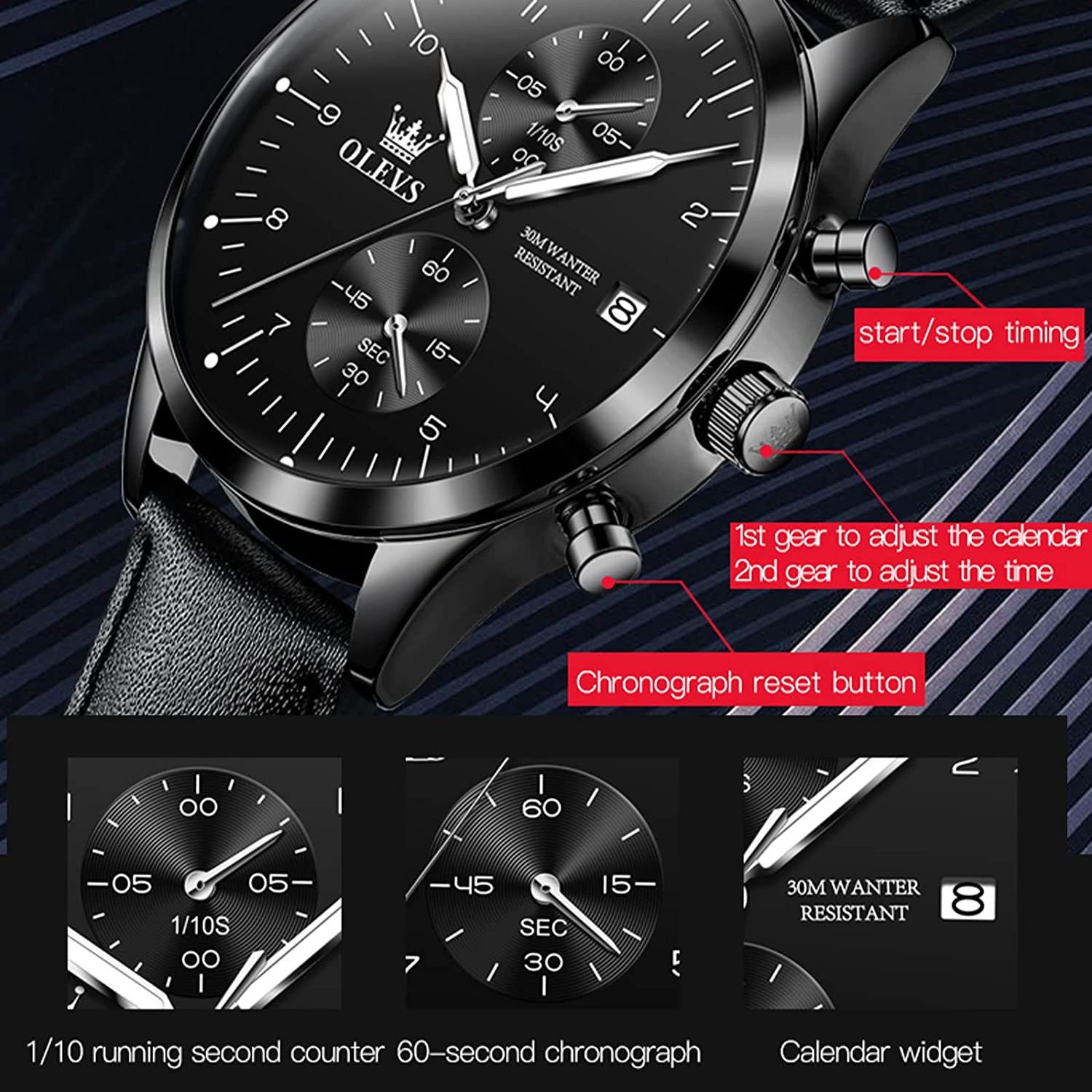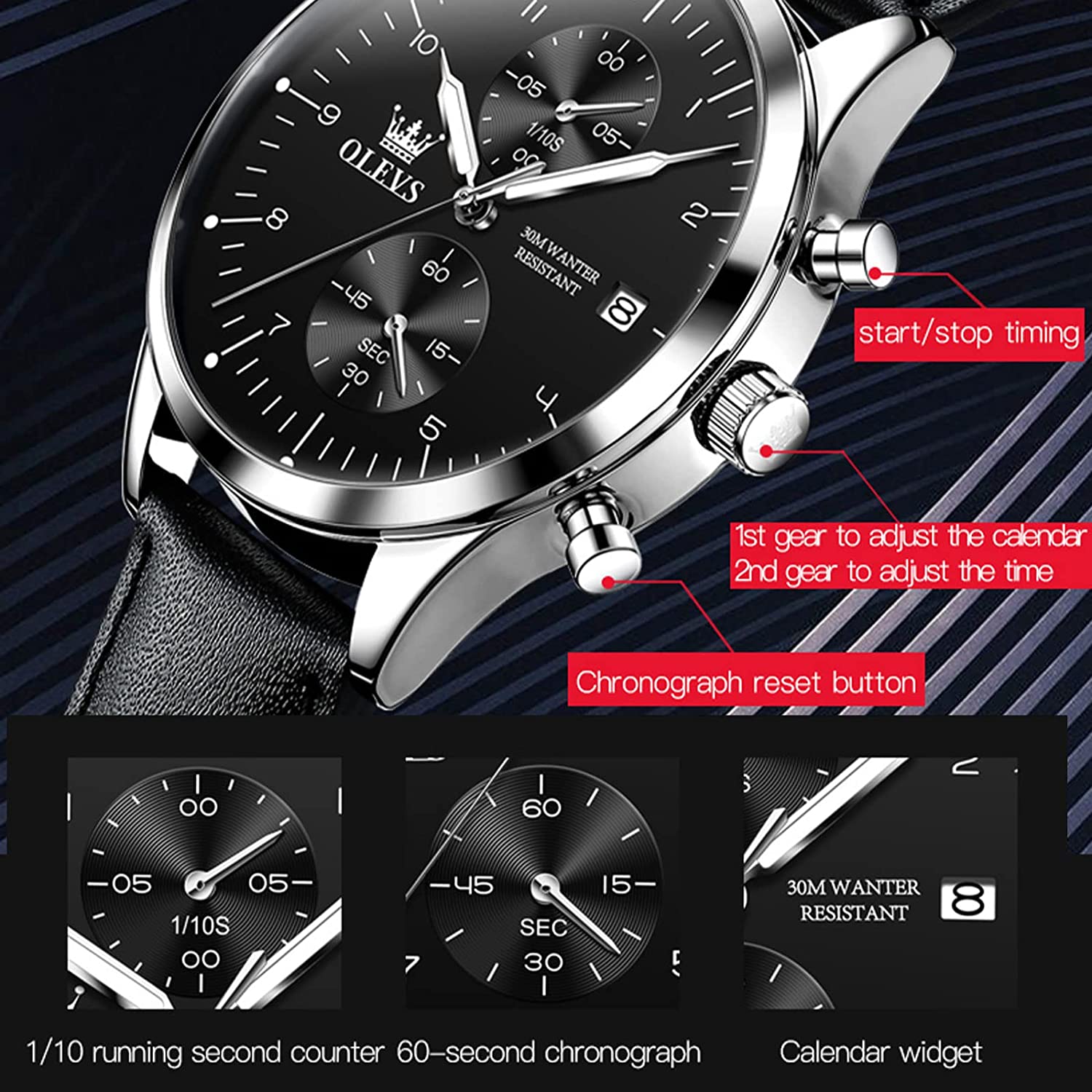- High quality original quartz movement, At 3 o'clock is calendar window, The sub dial in the north direction is 1 / 10 second subdial; The sub dial in the south direction is 60 second chronograph. 2 sub-dials provide precise time keeping. Accurate travel time; Stable performance; Escort your quality.