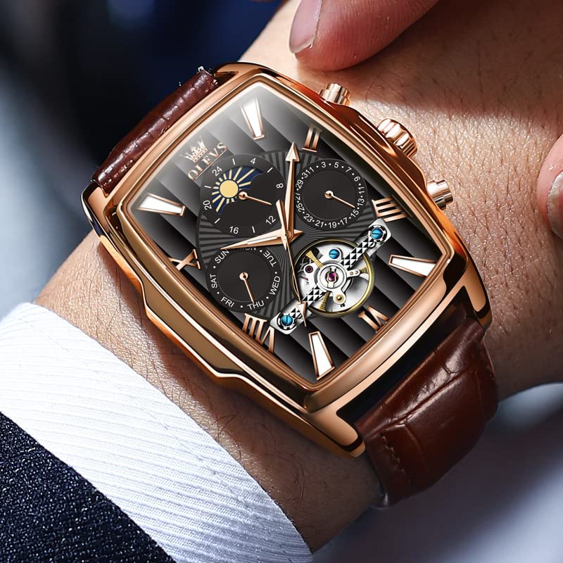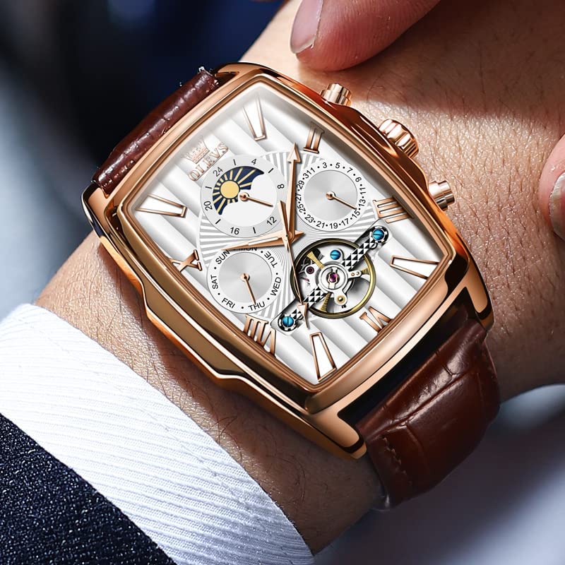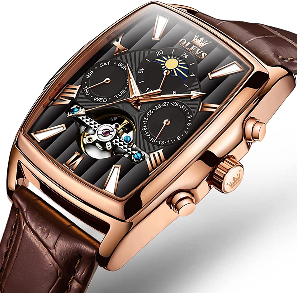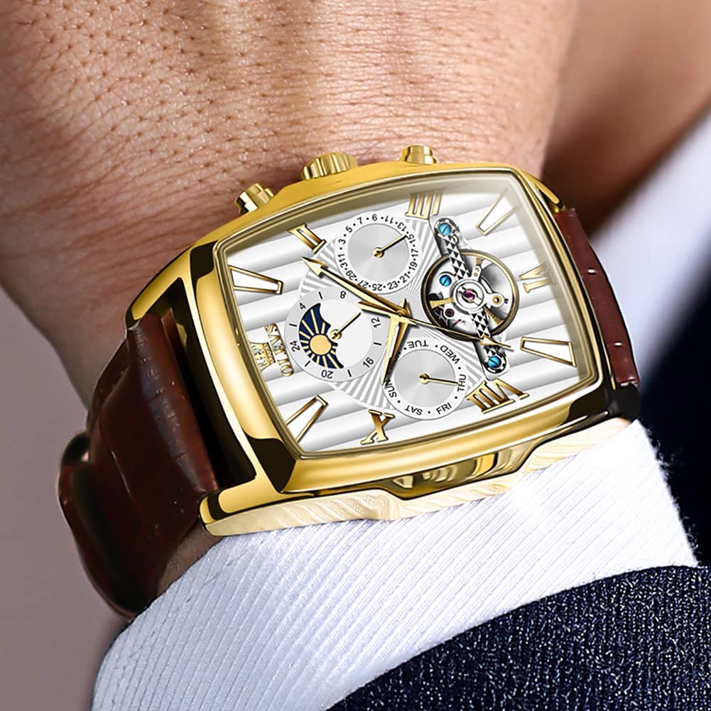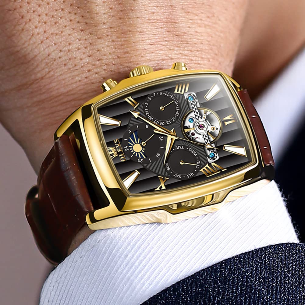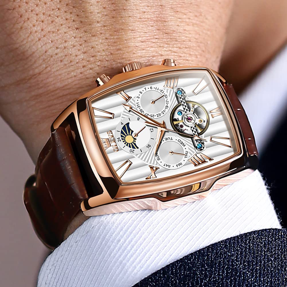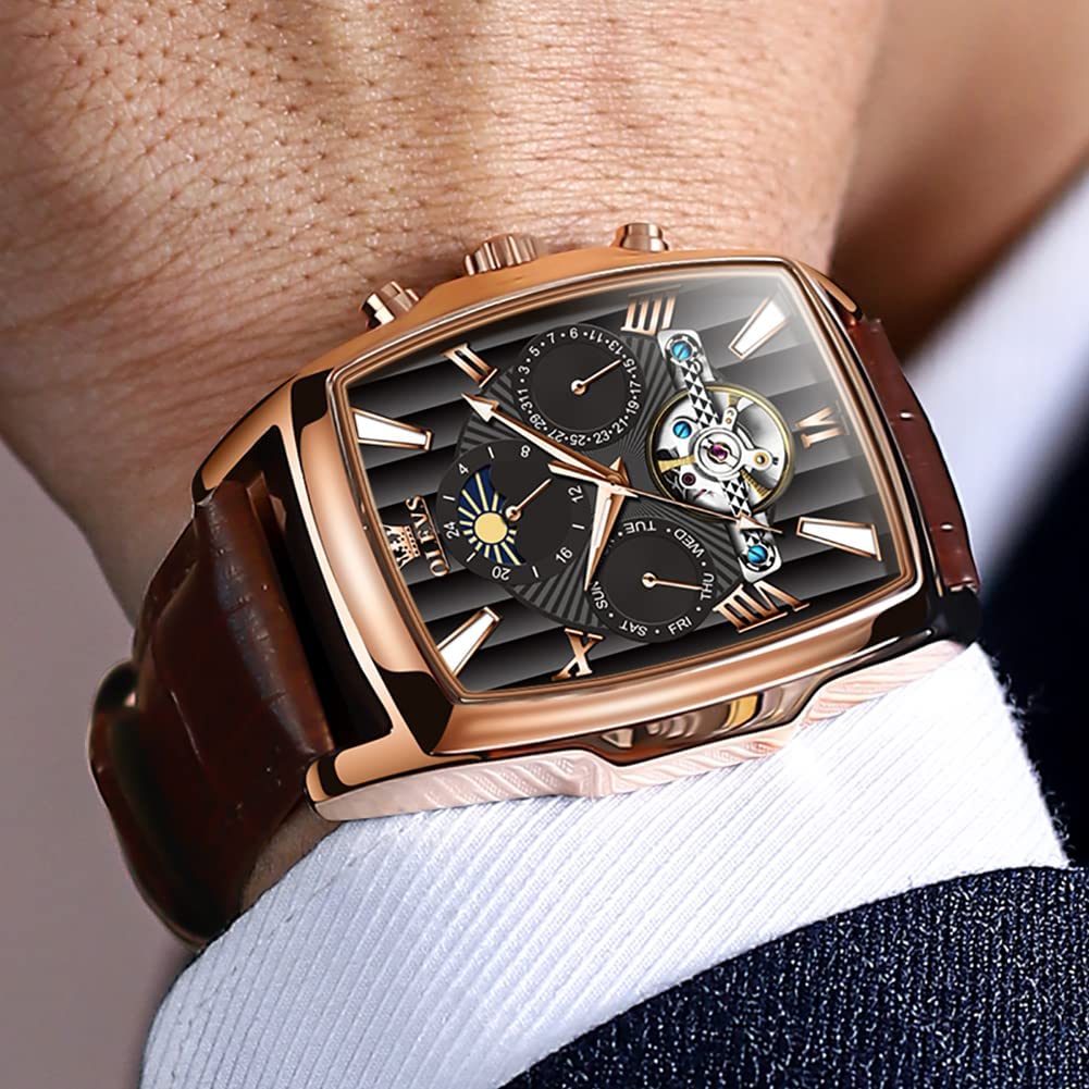 - Square Design Wrist Watches: The tourbillon is matched with the moon phase window and day date display,honorable crown logo,well-designed in dial layout. Exquisite decorative watch, unique square watch.