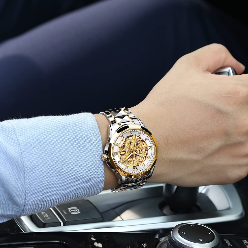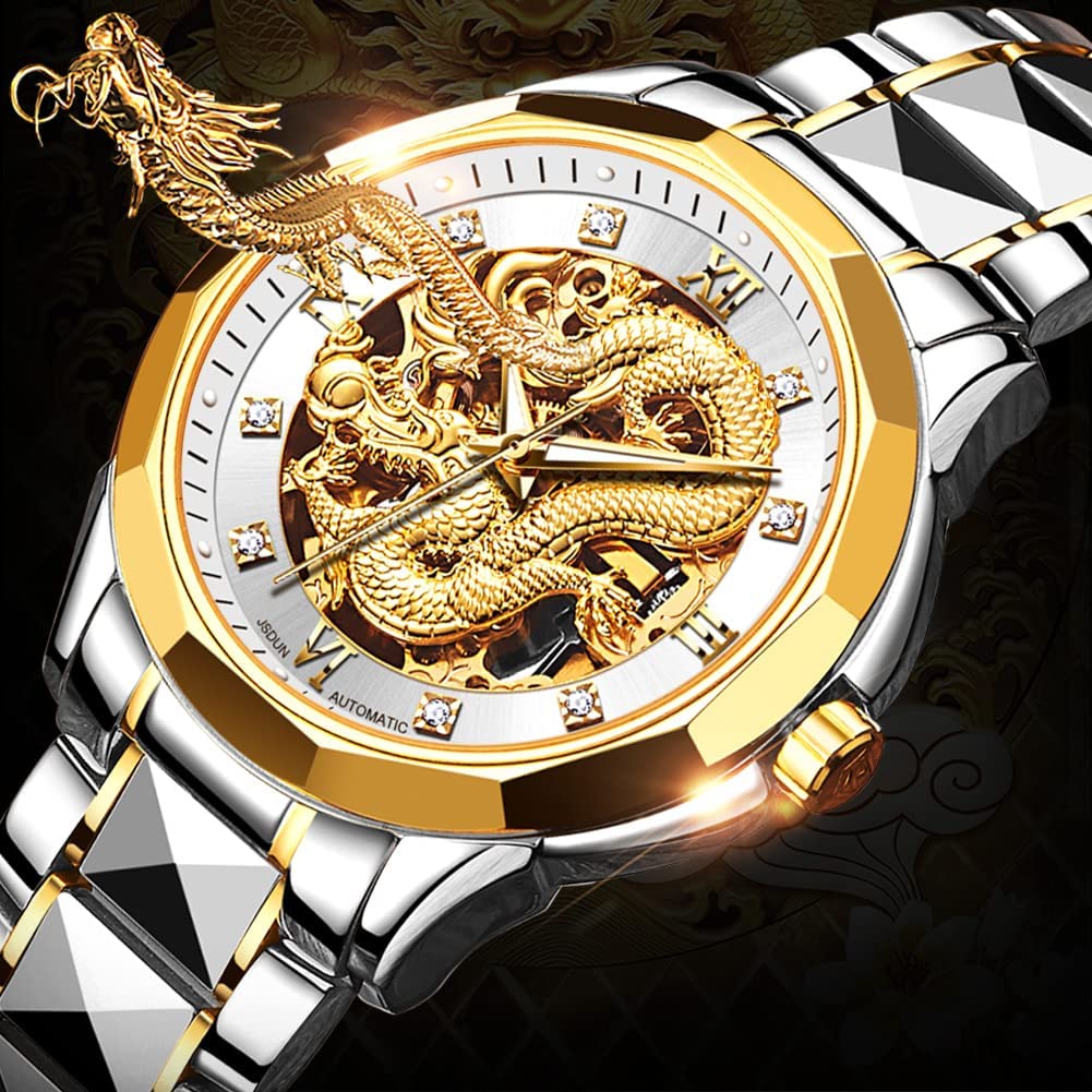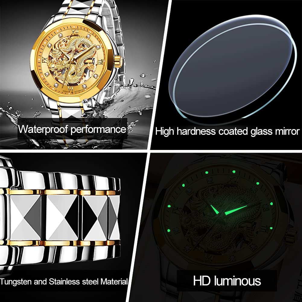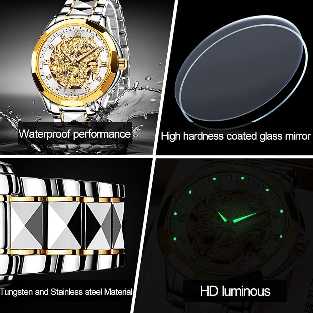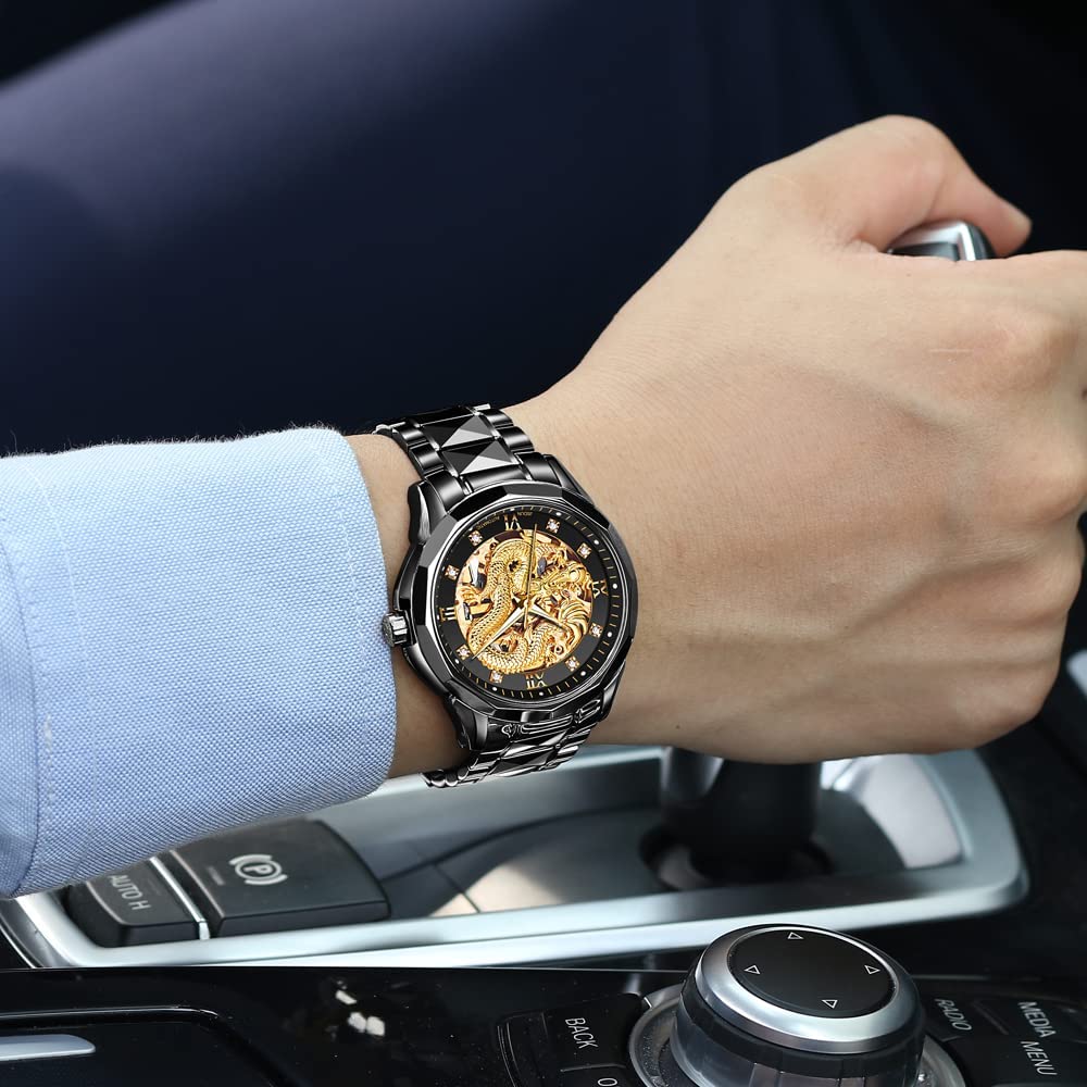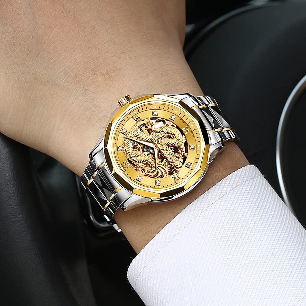• 👍Gold Skeleton Watches:Dial → 3D domineering dragon carving design and hollow design with toffee diamond hands, the strap is made of tungsten steel and butterfly double snaps,the whole is gorgeous and noble.