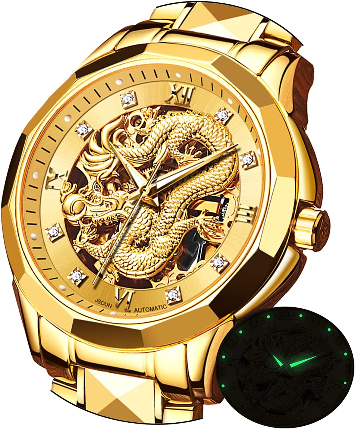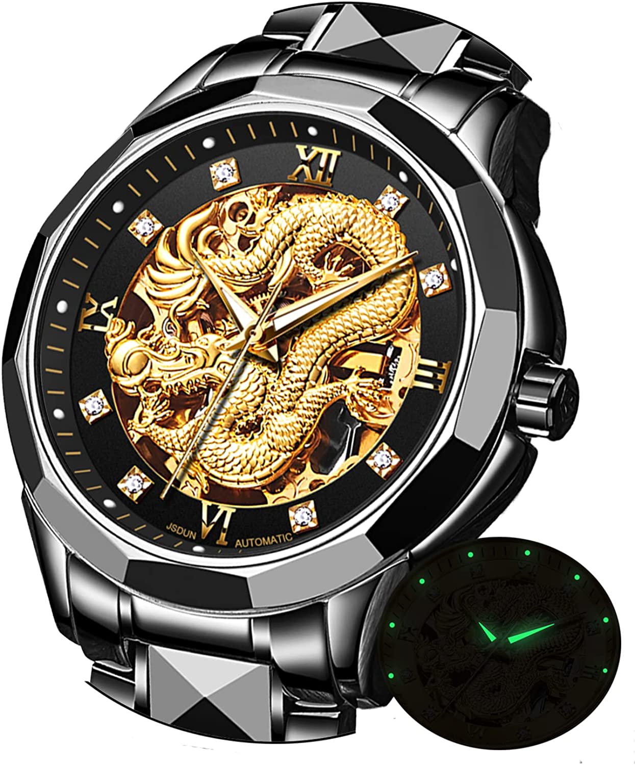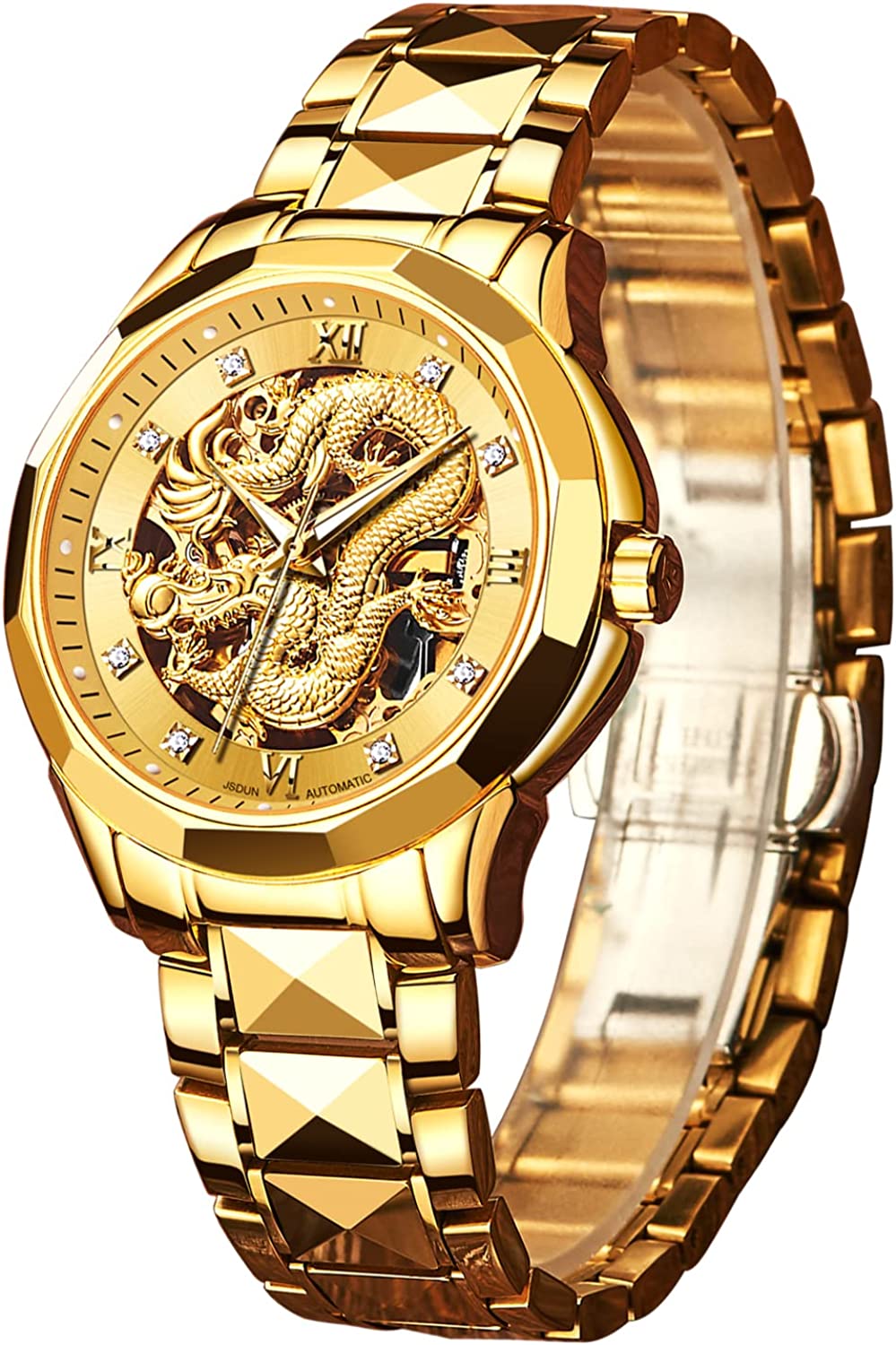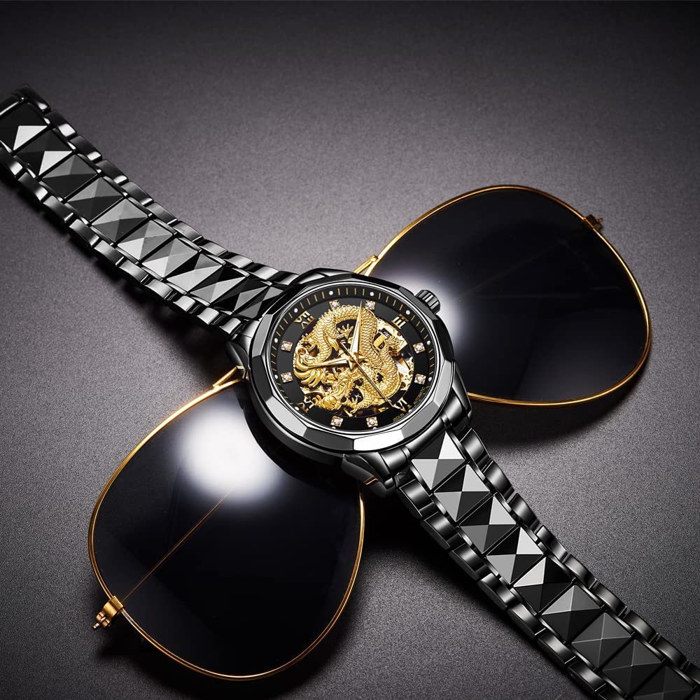 • 👍Gold Skeleton Watches:Dial → 3D domineering dragon carving design and hollow design with toffee diamond hands, the strap is made of tungsten steel and butterfly double snaps,the whole is gorgeous and noble.