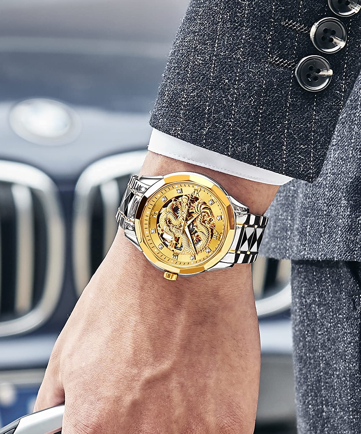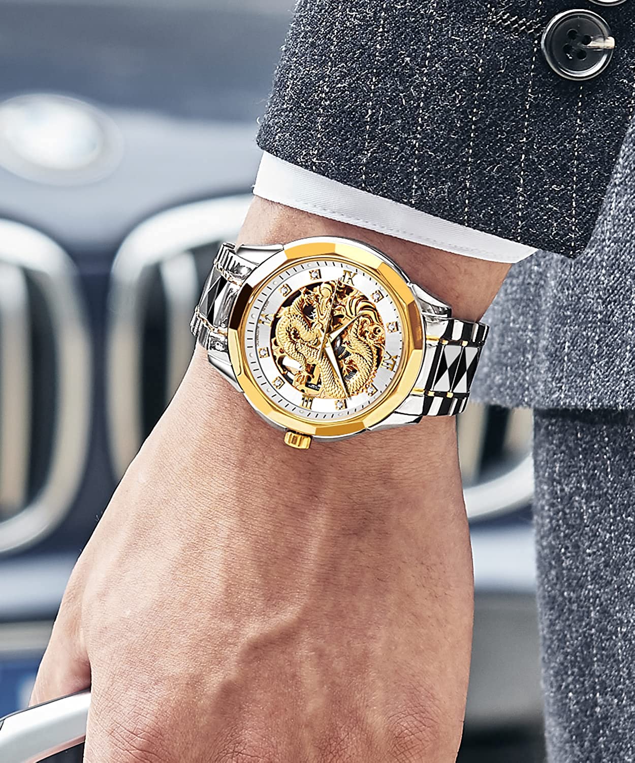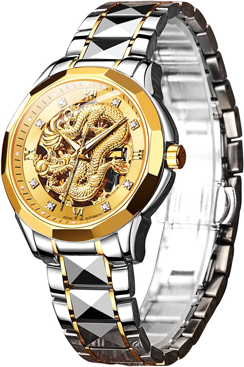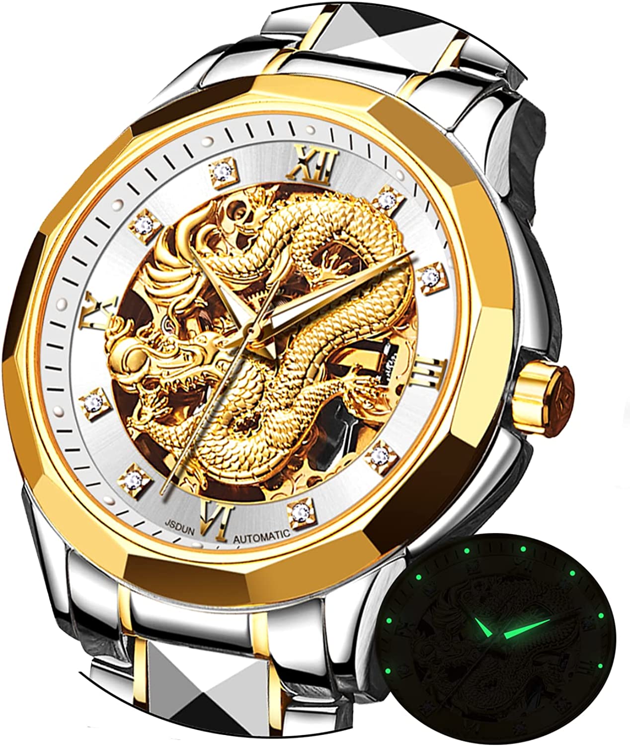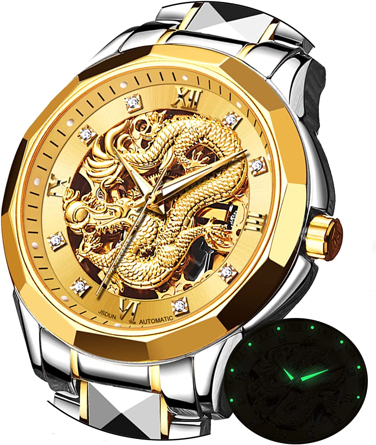 • 👍Gold Skeleton Watches:Dial → 3D domineering dragon carving design and hollow design with toffee diamond hands, the strap is made of tungsten steel and butterfly double snaps,the whole is gorgeous and noble.