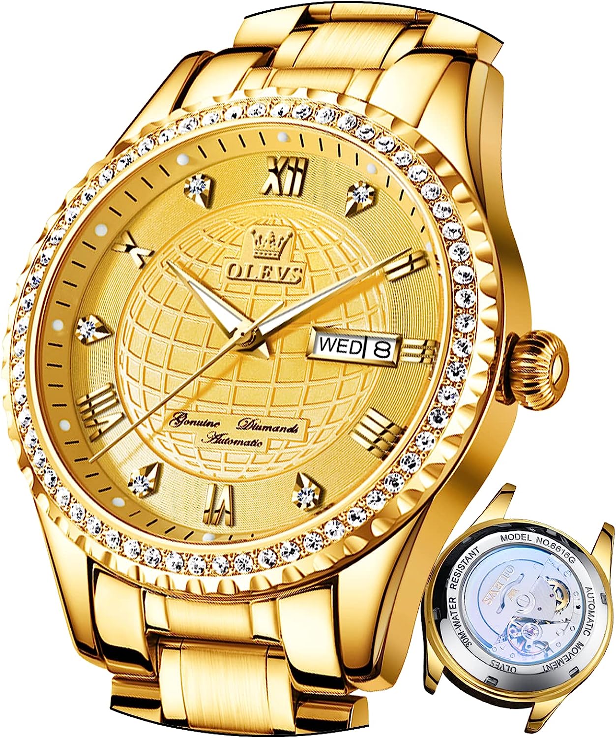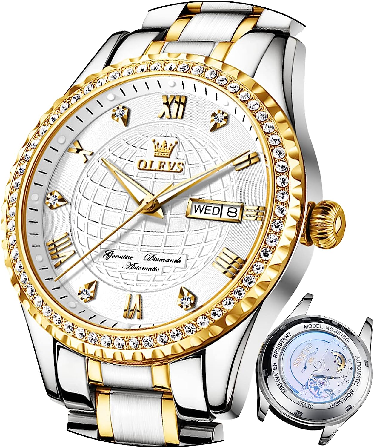 - 👍Silver Mens Watches:Diamond dial and double date display,more in line with modern aesthetics.The back skeleton design allows you to see the operation of the gears, and you can wind it manually or automatically to enjoy the traditional mechanical watch.
