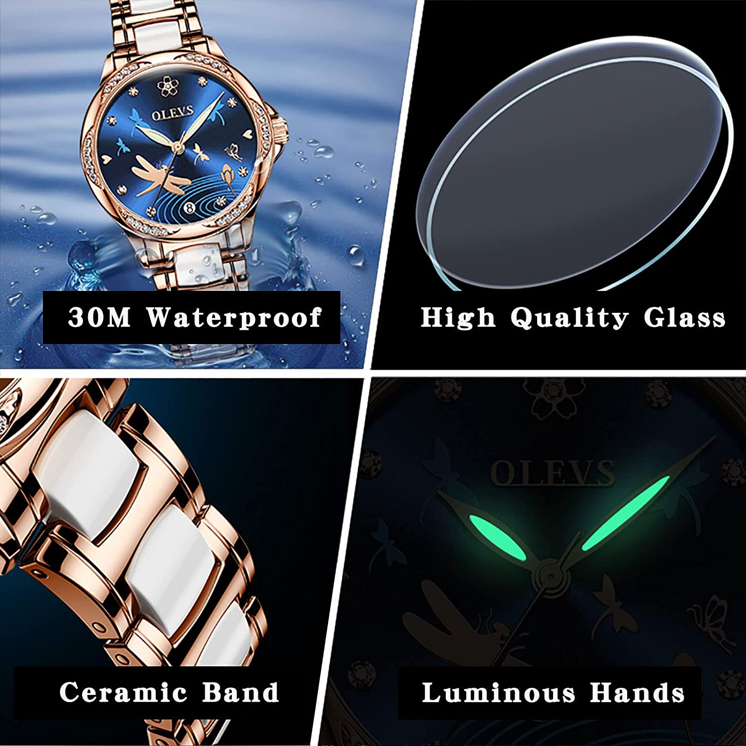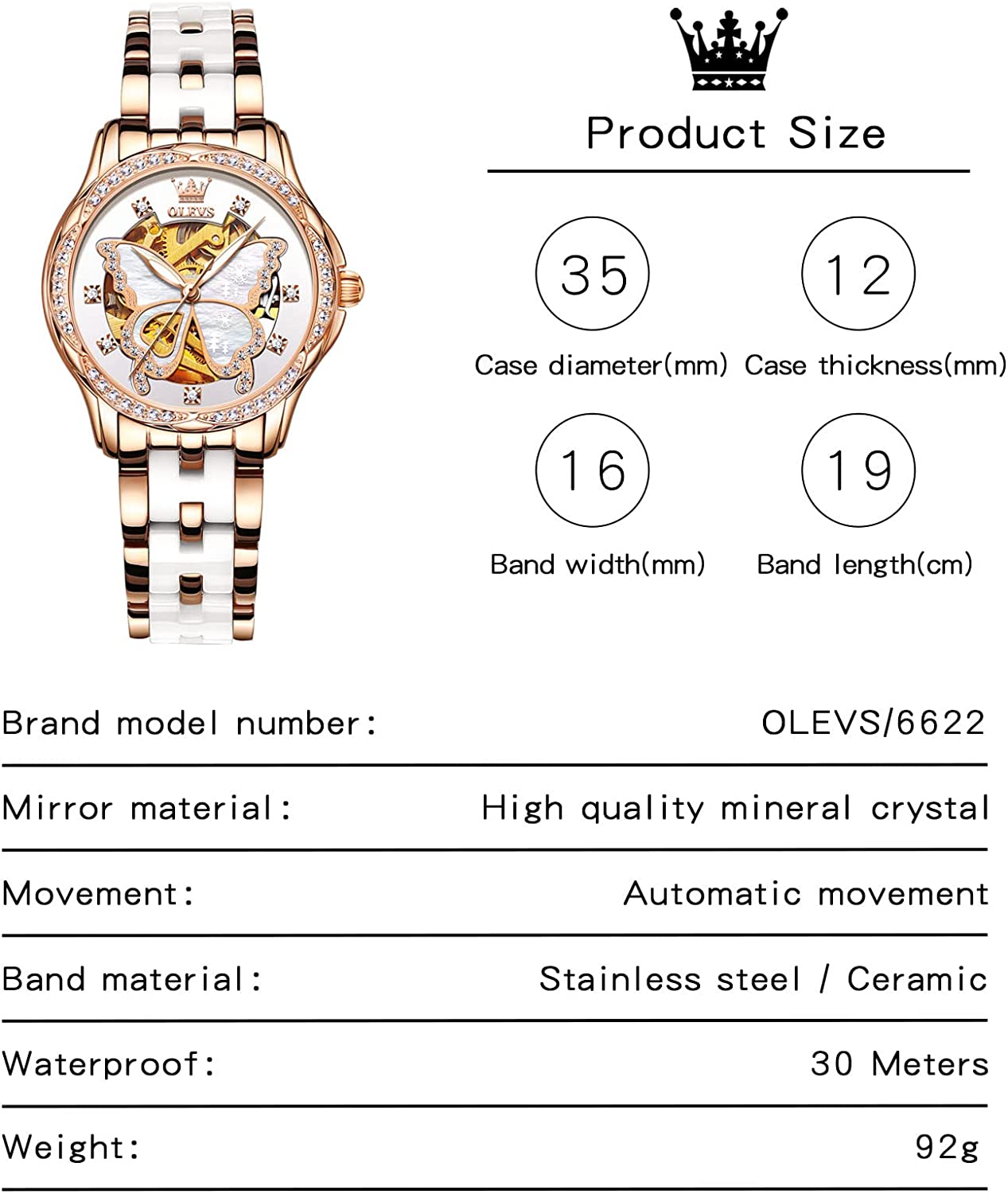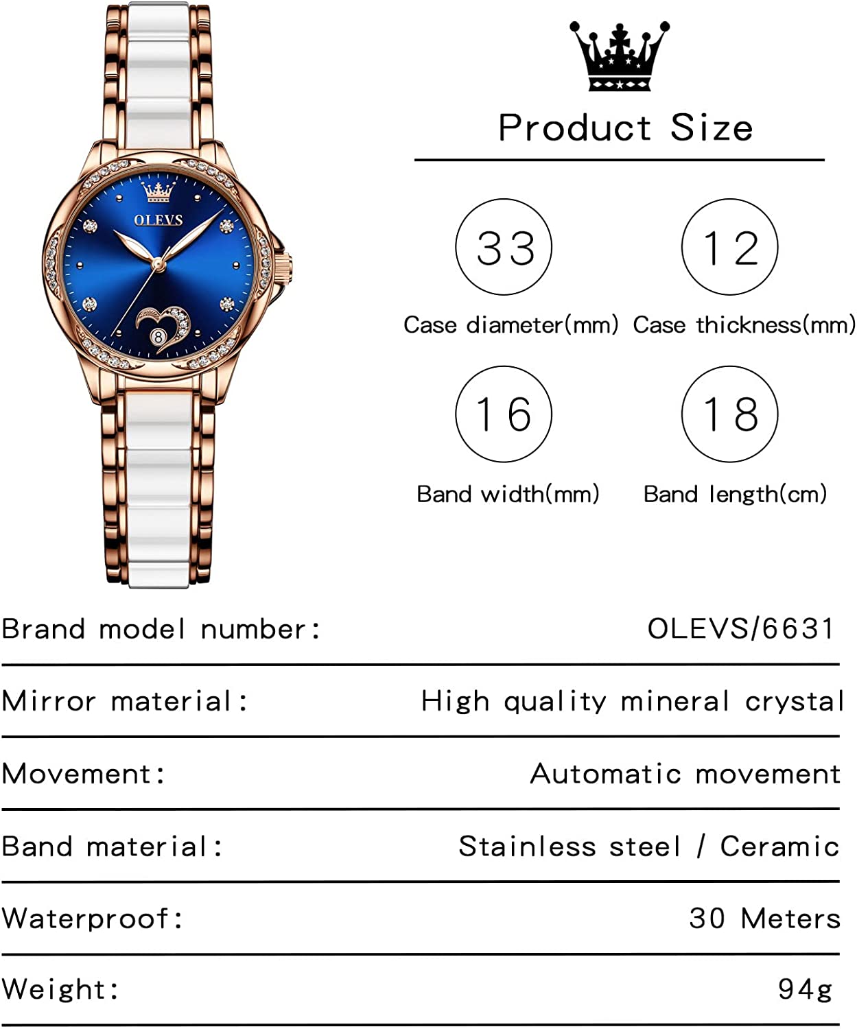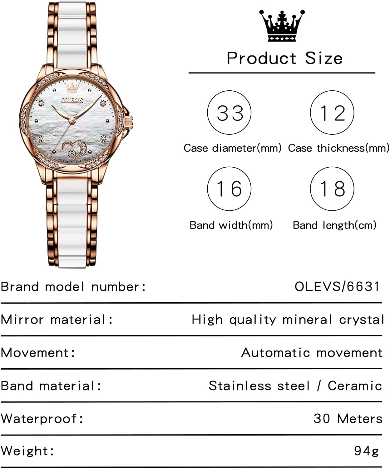 - 💎Ceramic Band&Water Resistant:Two-tone stainless steel ceramic band with folding clasp, easy to wear while still offering excellent comfort. (The band is too short, you can contact the seller, a watch link will be sent). Water resistant to 100 feet (30M),Suitable for everyday use. Splash/rain resistant. Not suitable for showering, bathing, swimming, snorkeling and water related work.