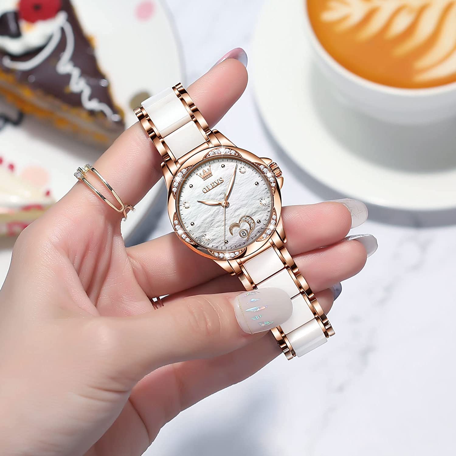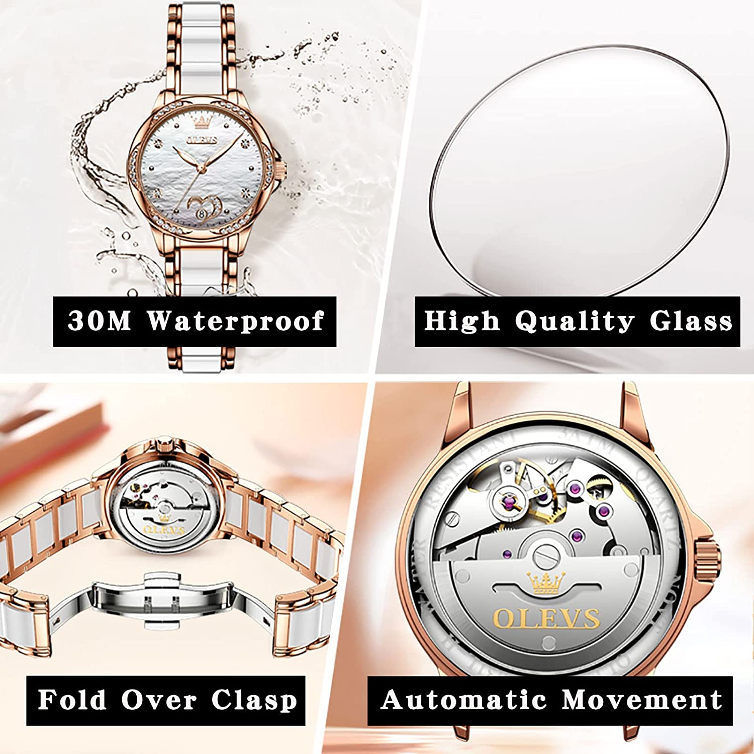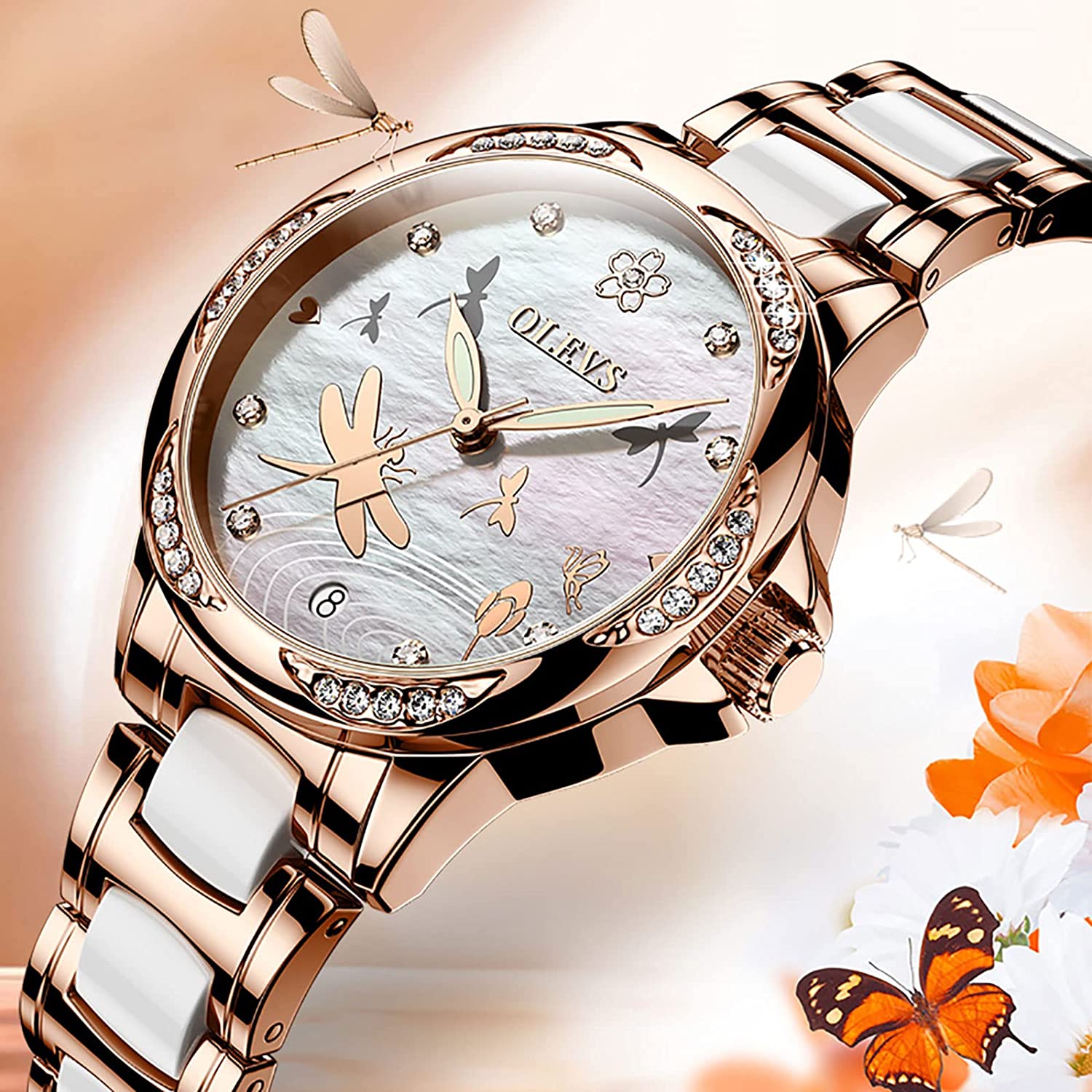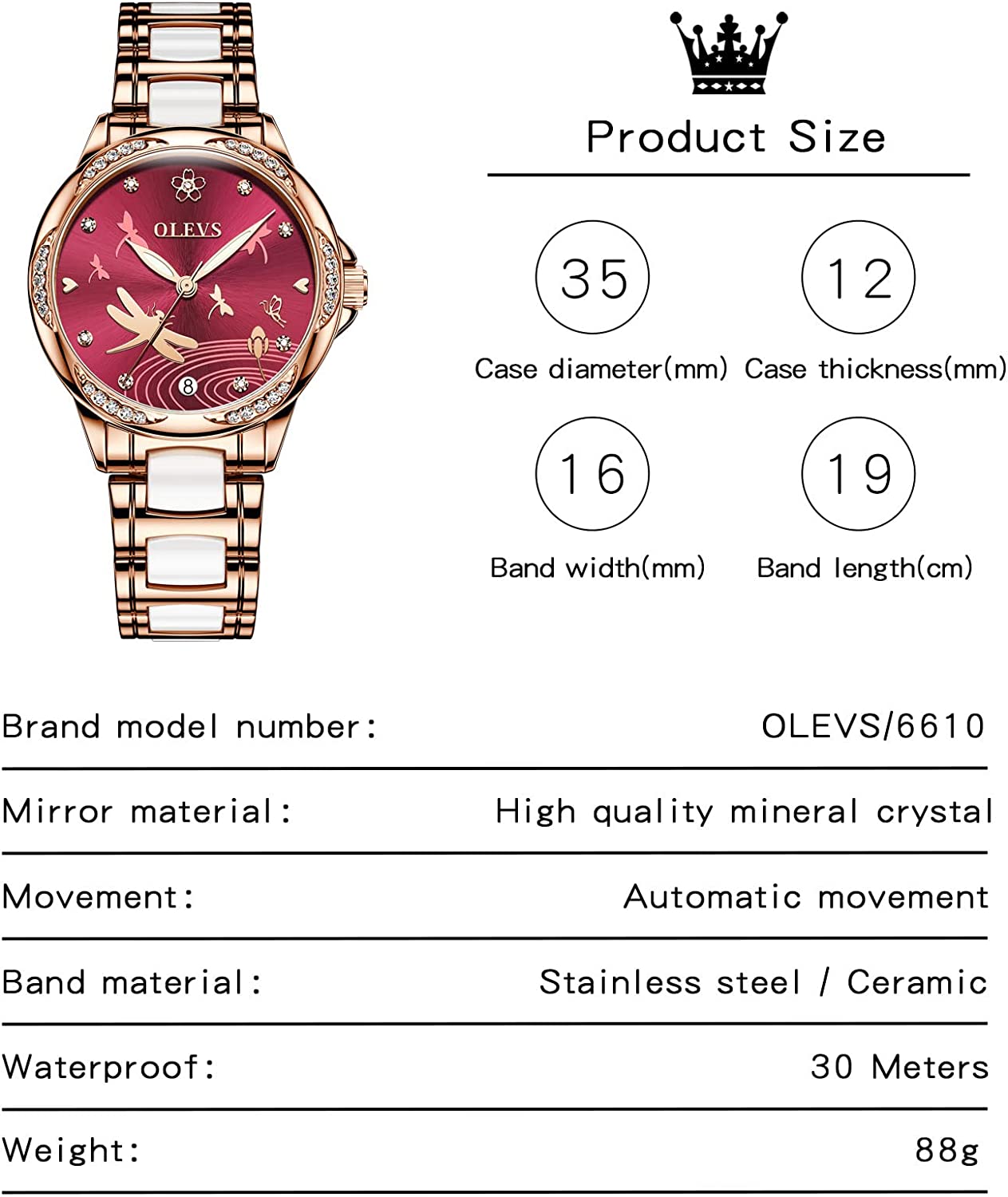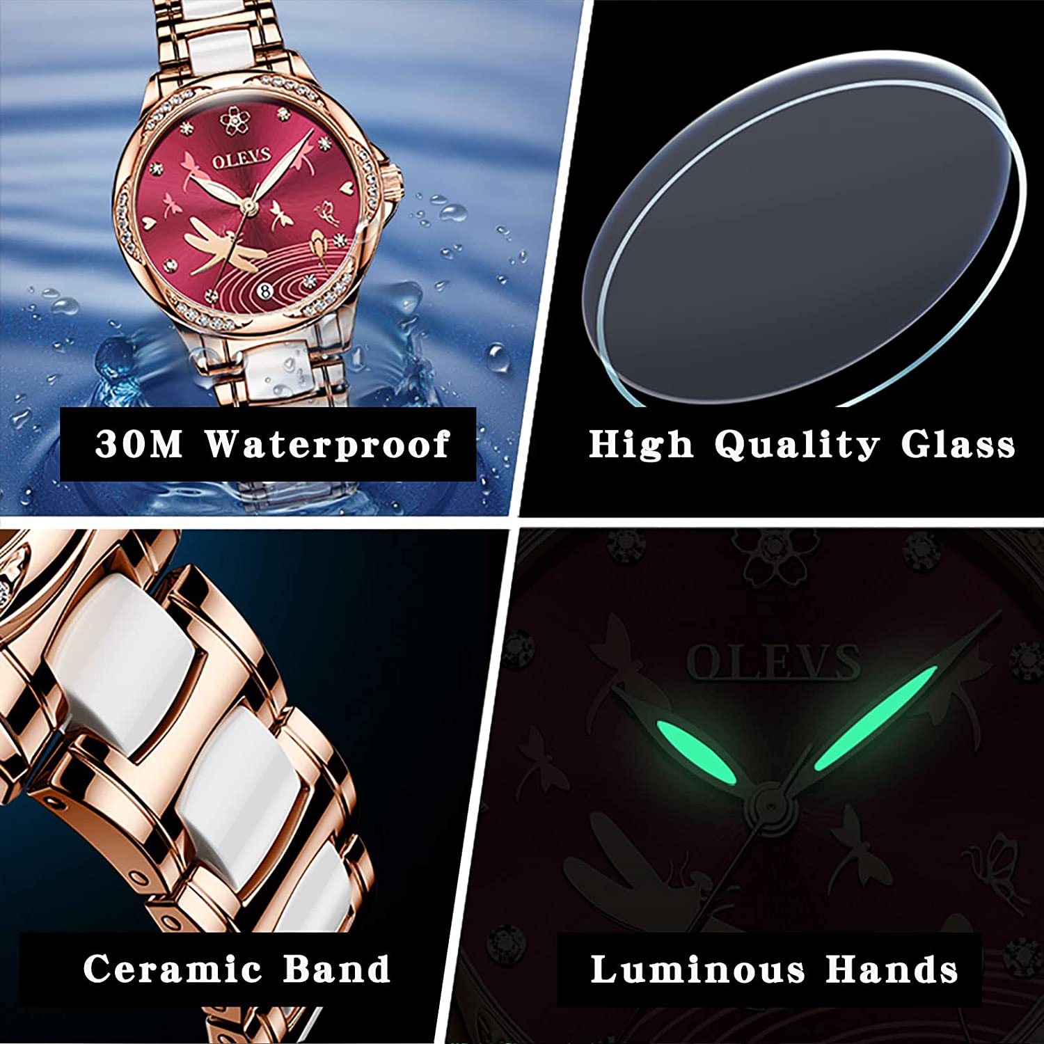 - 💎Ceramic Band&Water Resistant:Two-tone stainless steel ceramic band with folding clasp, easy to wear while still offering excellent comfort. (The band is too short, you can contact the seller, a watch link will be sent). Water resistant to 100 feet (30M),Suitable for everyday use. Splash/rain resistant. Not suitable for showering, bathing, swimming, snorkeling and water related work.