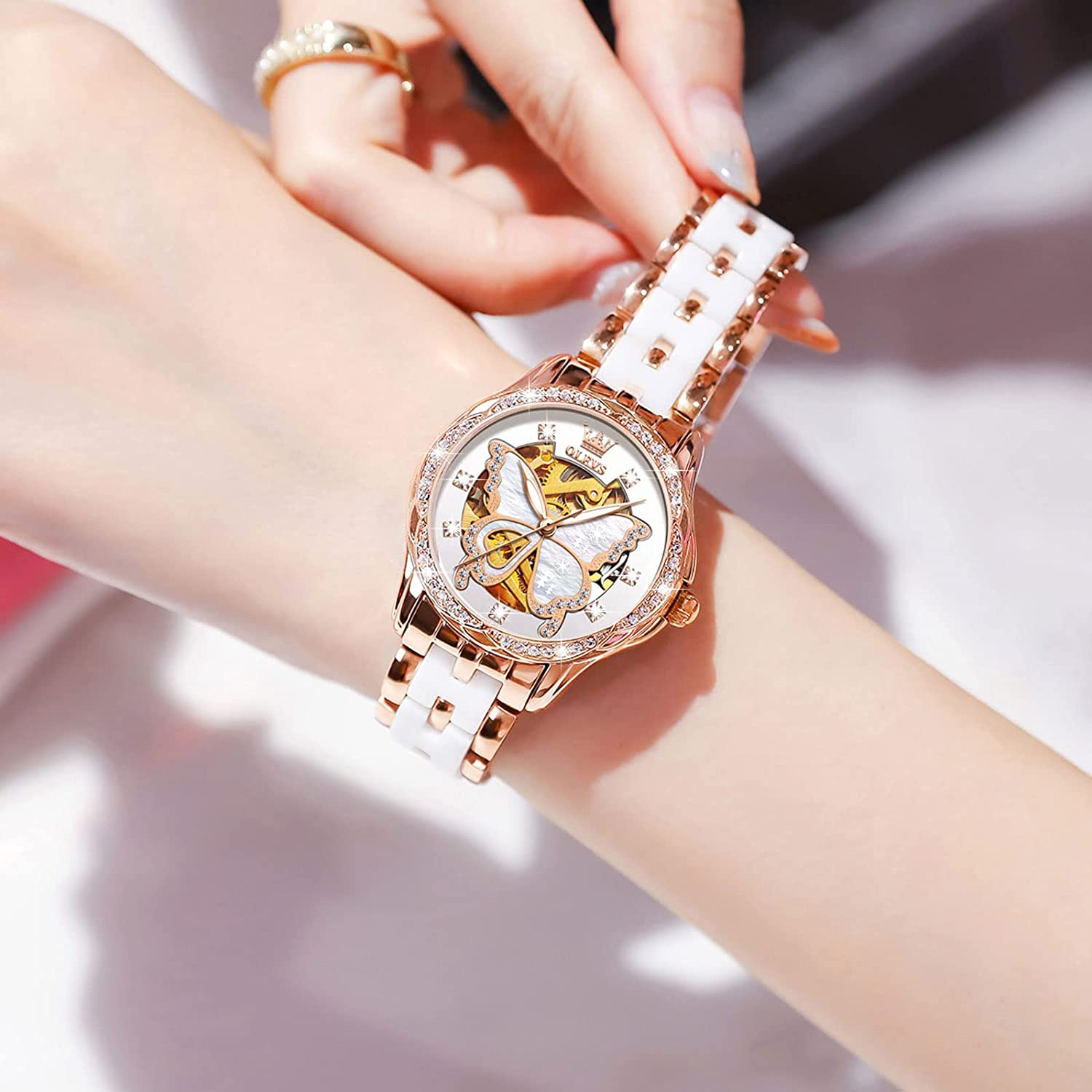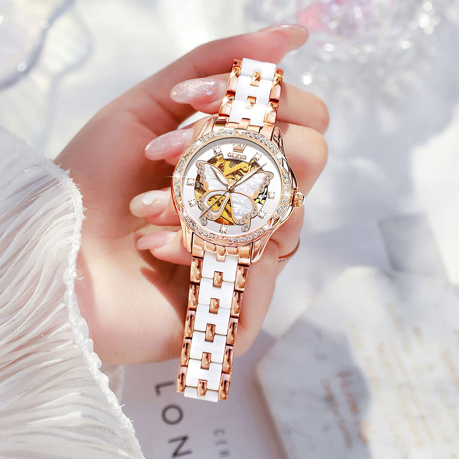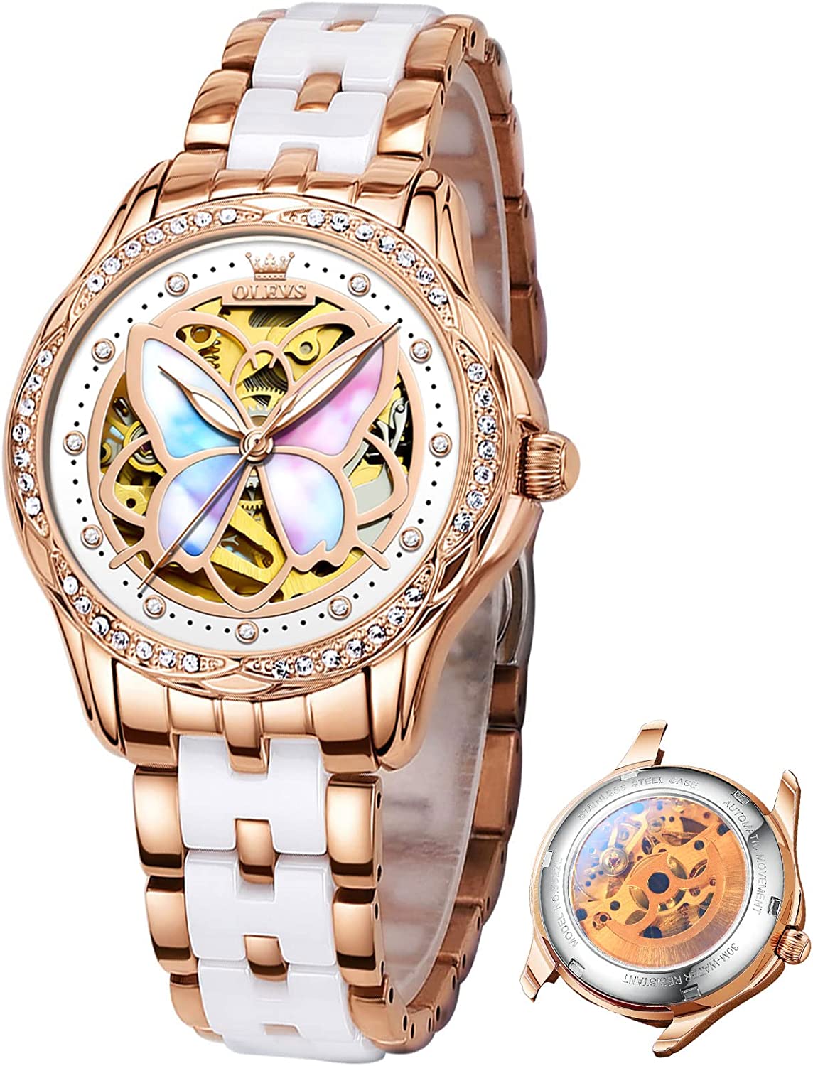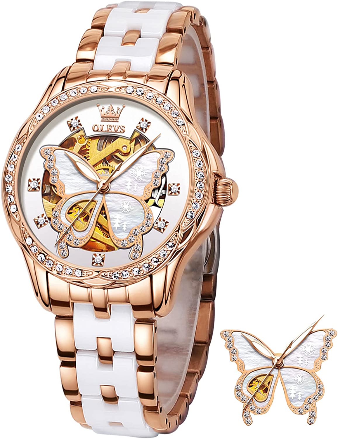 - ❤️Elegant Design:Shiny diamond and elegant butterfly skeleton design,the exquisite dial and imported automatic movement make the watch show elegance and luxury everywhere.This wrist watch in the charming grace will definitely bring you more than the bright beauty.