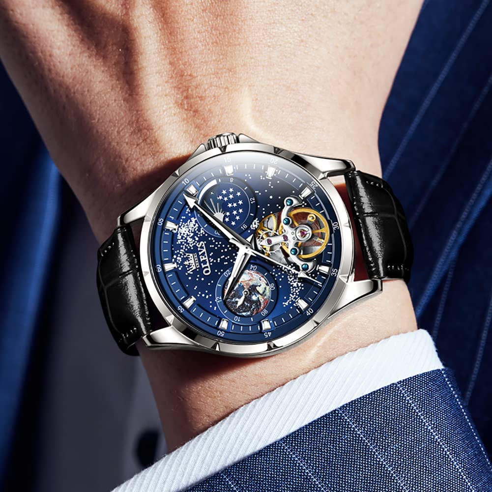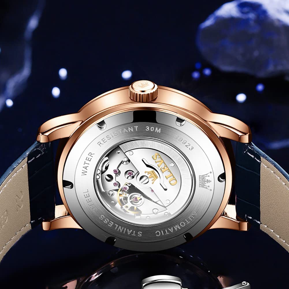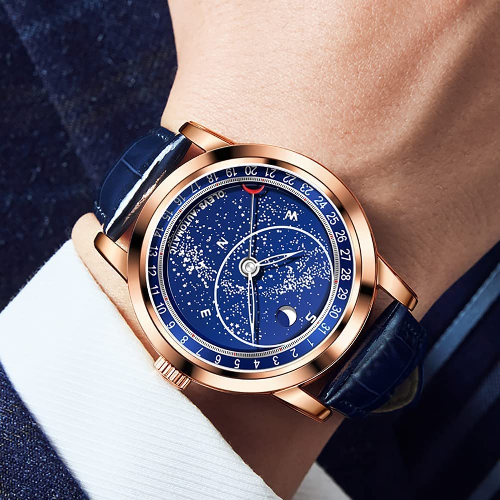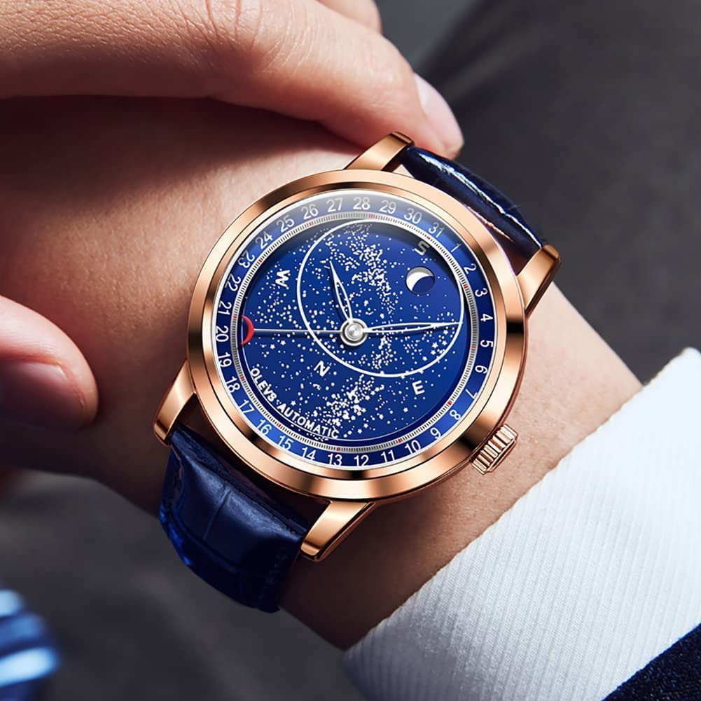 • OLEVS Men Watch Starry Sky Dial Universe Milky Way Automatic Wind Up Blue Leather Strap Fashion Dress Waterproof Luminous Watches #1144