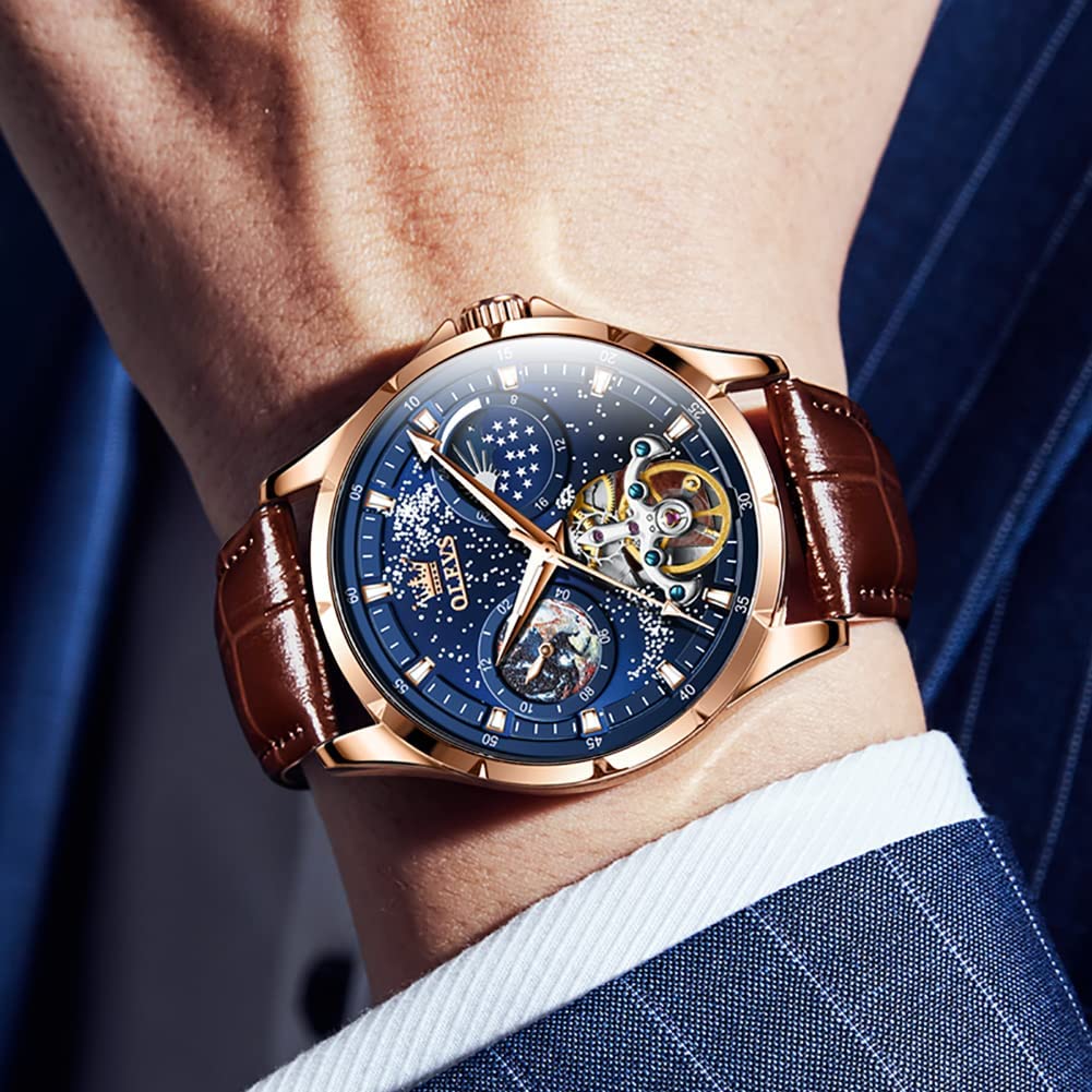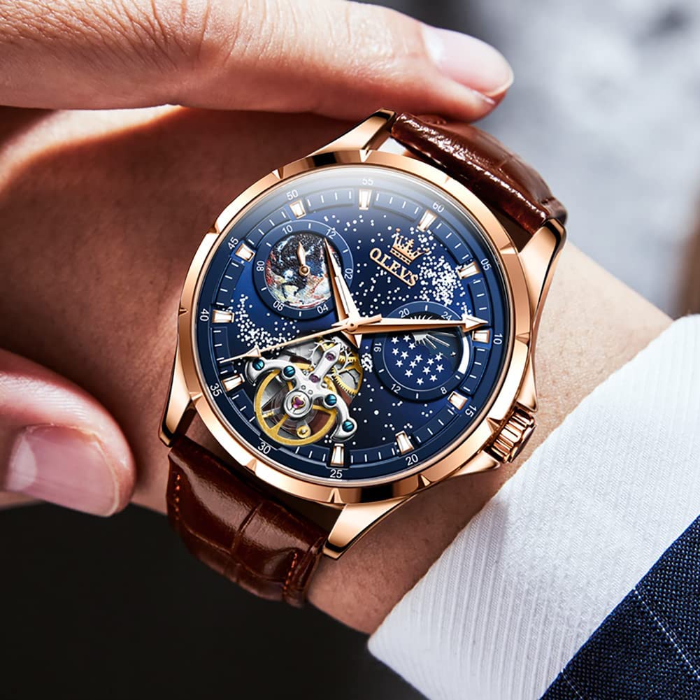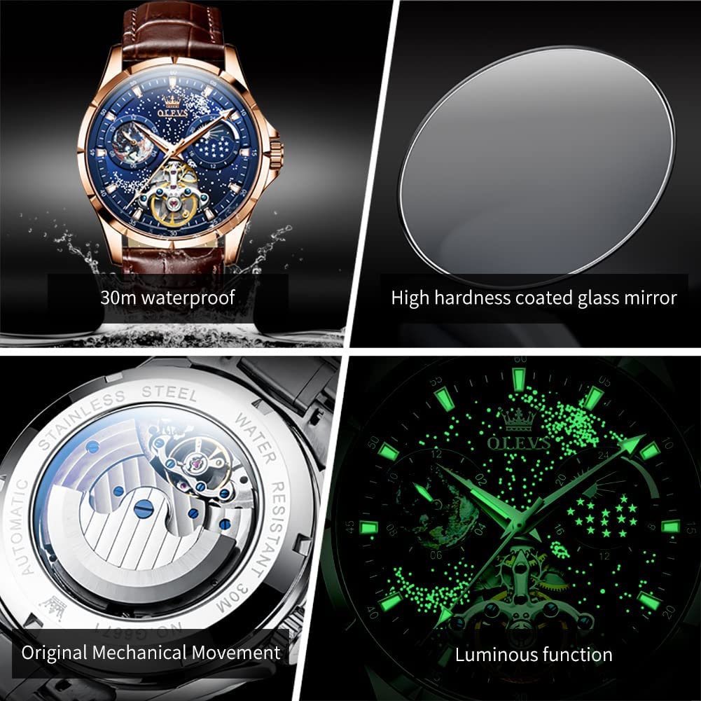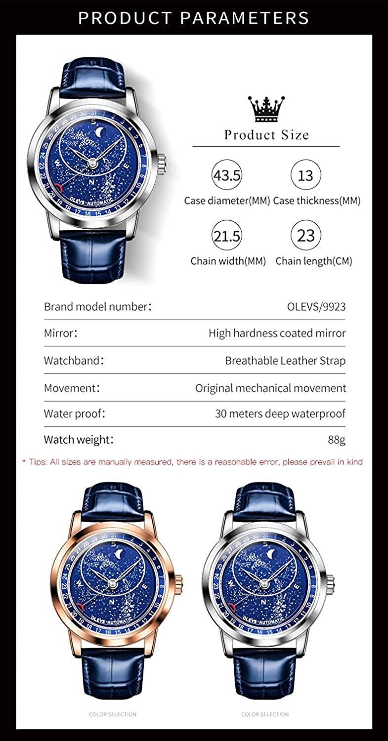 • OLEVS Men Watch Starry Sky Dial Universe Milky Way Automatic Wind Up Blue Leather Strap Fashion Dress Waterproof Luminous Watches #1144