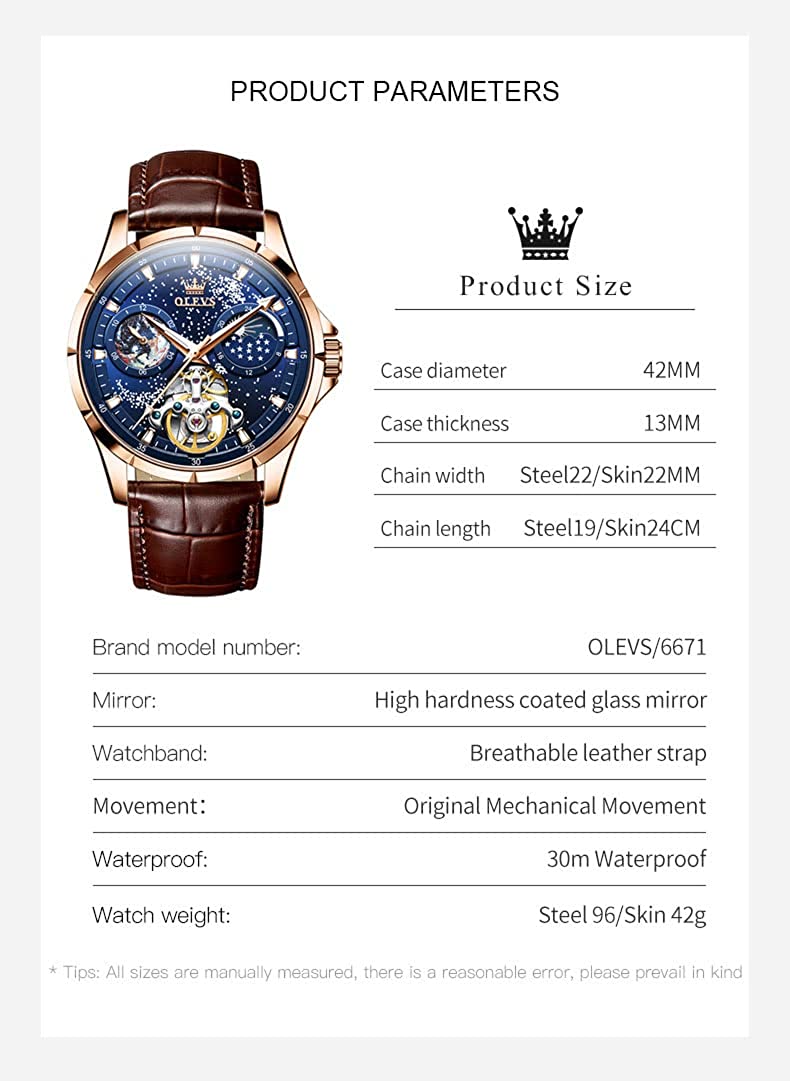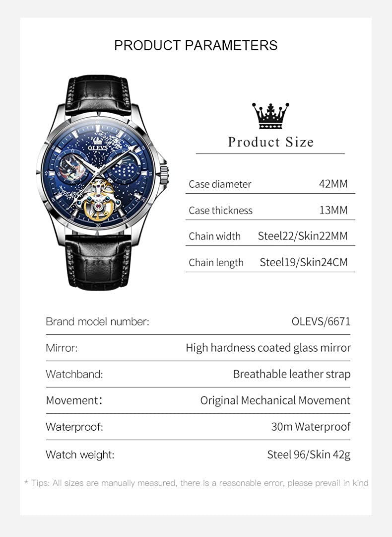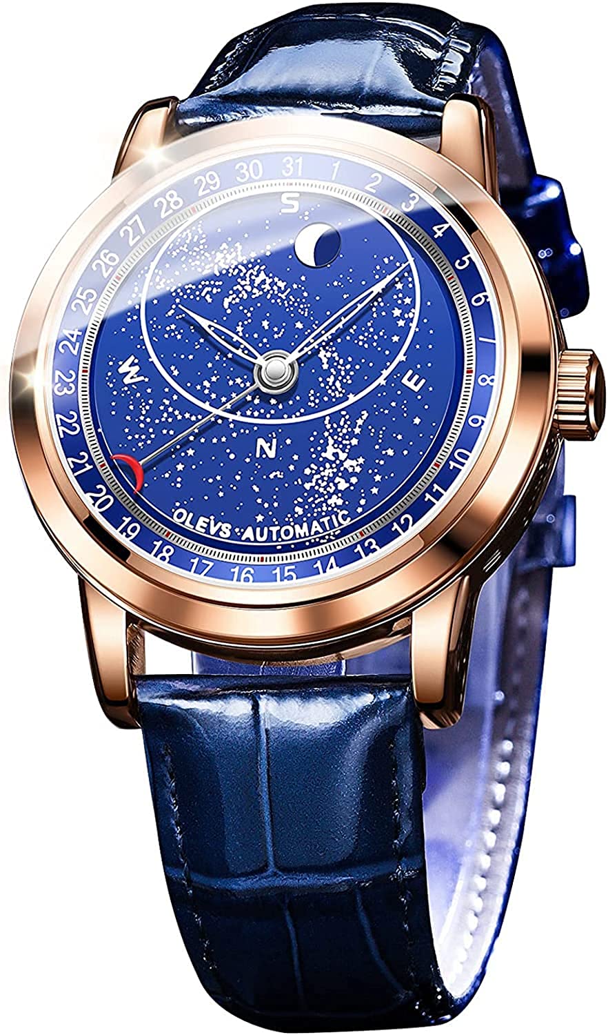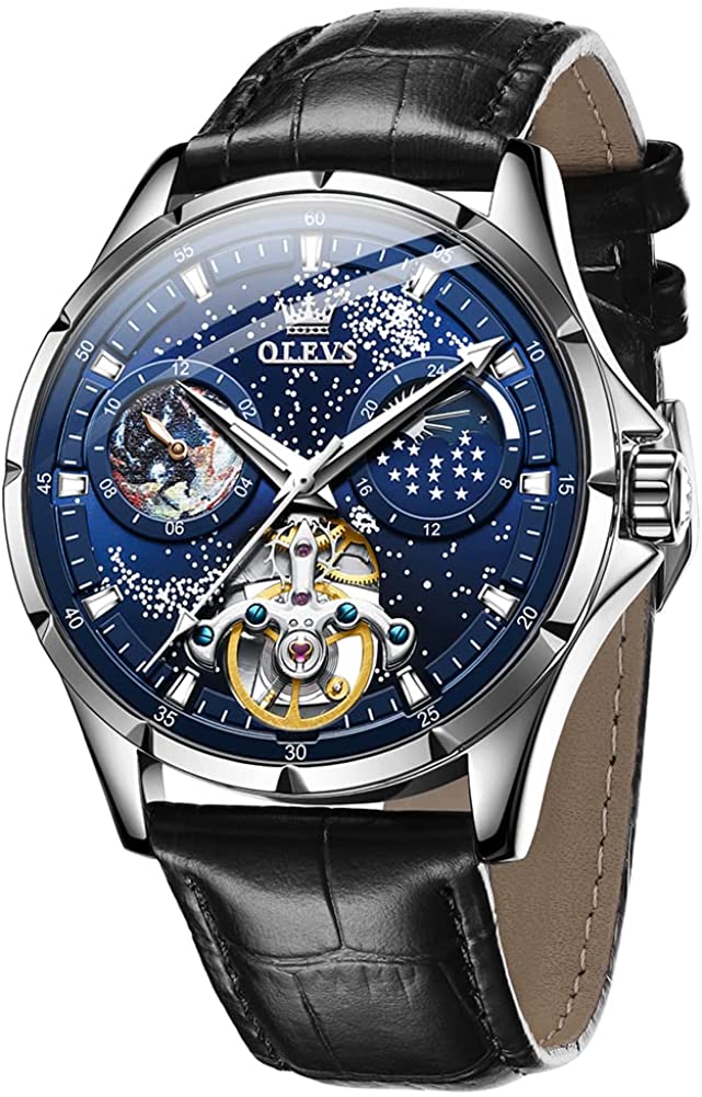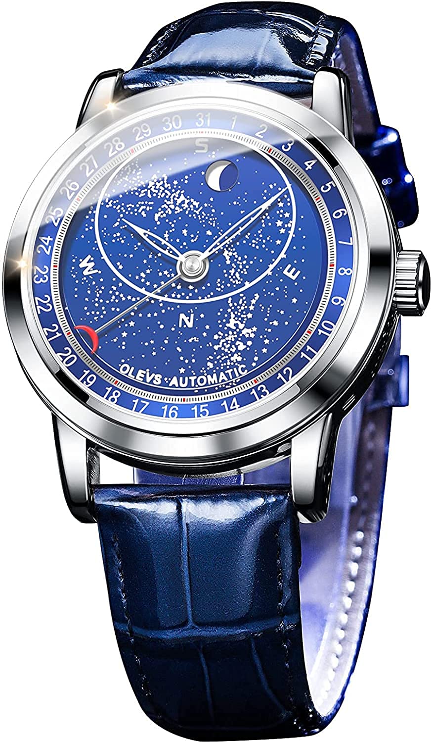 • OLEVS Men Watch Starry Sky Dial Universe Milky Way Automatic Wind Up Blue Leather Strap Fashion Dress Waterproof Luminous Watches #1144